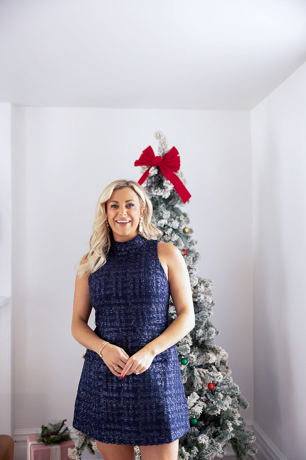 The Navy Tweed Dress from Sincerely Ours is the timeless winter wardrobe piece you’ll reach for again and again. Made from a rich, textured tweed in a deep navy hue, this dress brings a sophisticated silhouette with a flattering A-line fit and a clean, high neckline that keeps the look modern and refined.