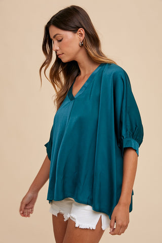 SATIN V NECK SHORT SLEEVE BLOUSE TOP (TEAL)