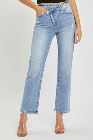 HIGHRISE CROSSOVER STRAIGHT LEG JEANS