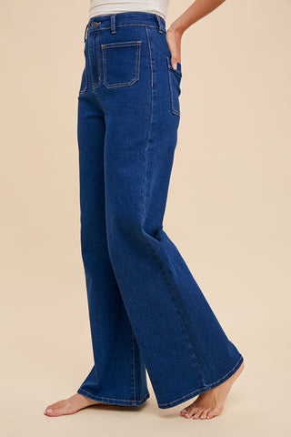 FRONT TWO POCKET STRETCH WIDE LEG DENIM JEANS (DARK DENIM)