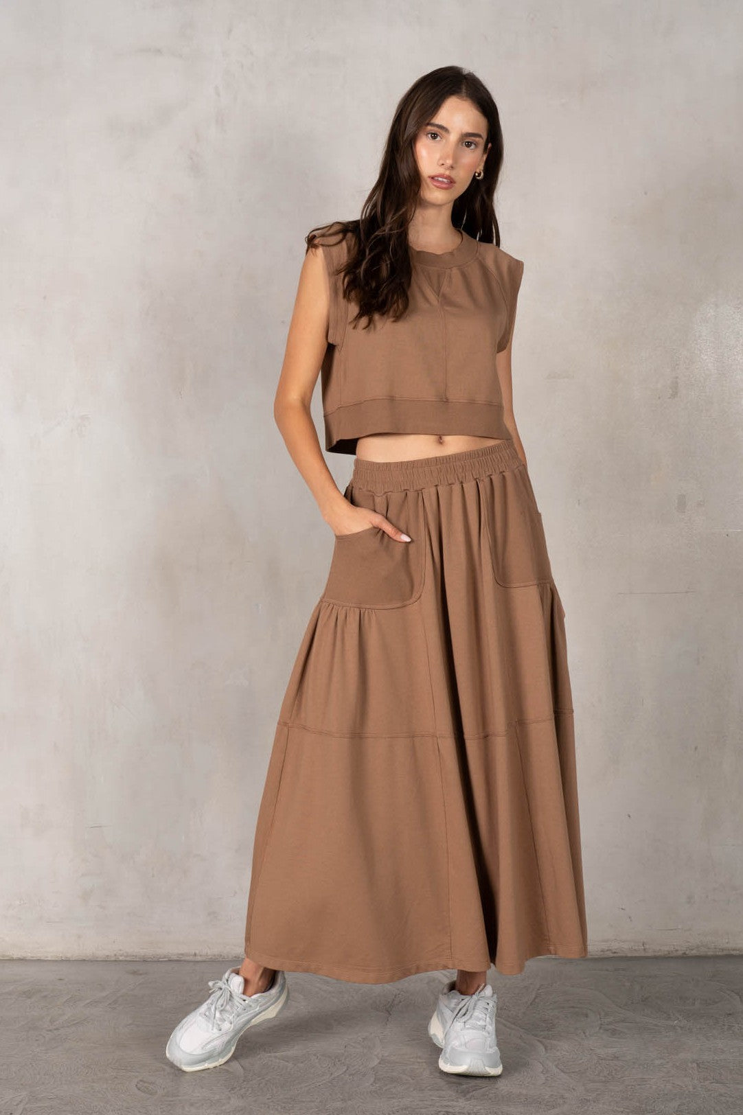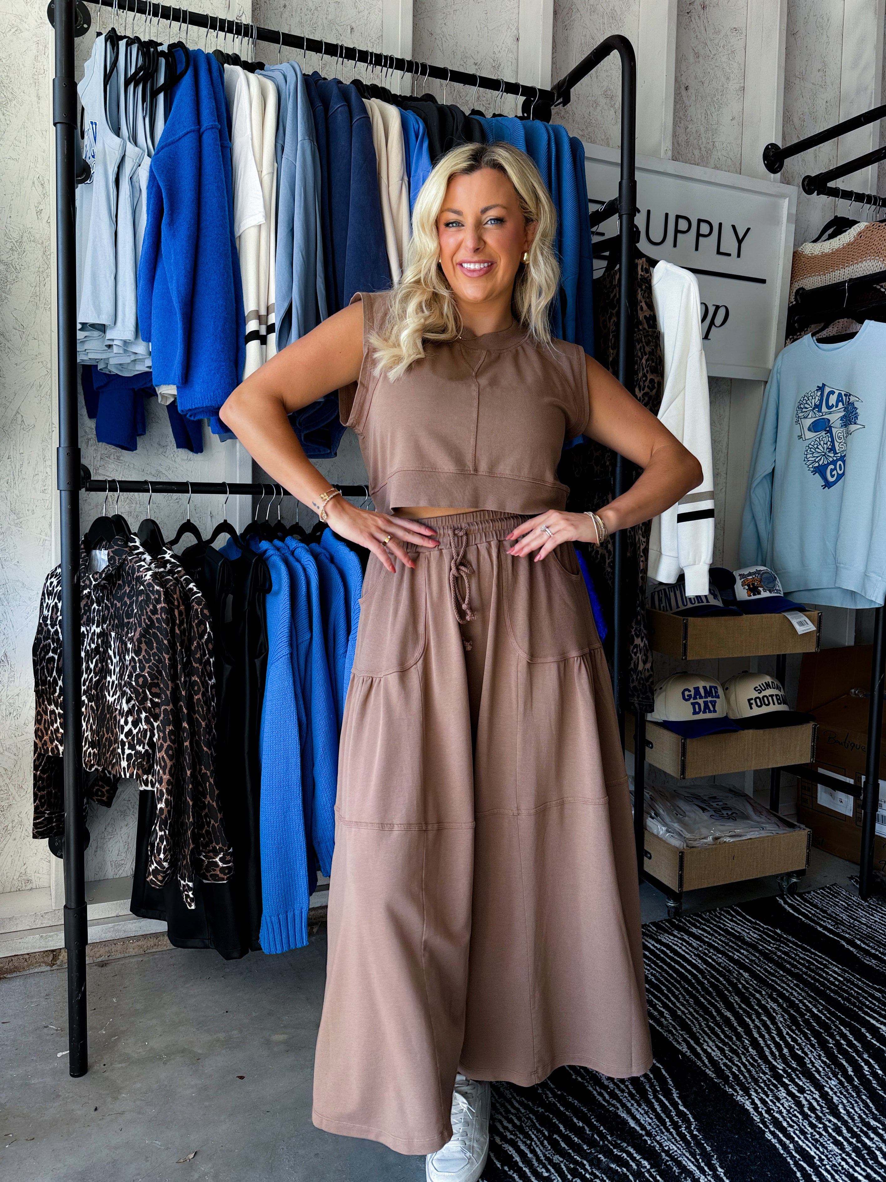 Fashionably combine a halter neck tank crop top with coordinated, wide-leg opening rib mix and match pants. The perfect way to turn heads with a look that's both bold and timeless.